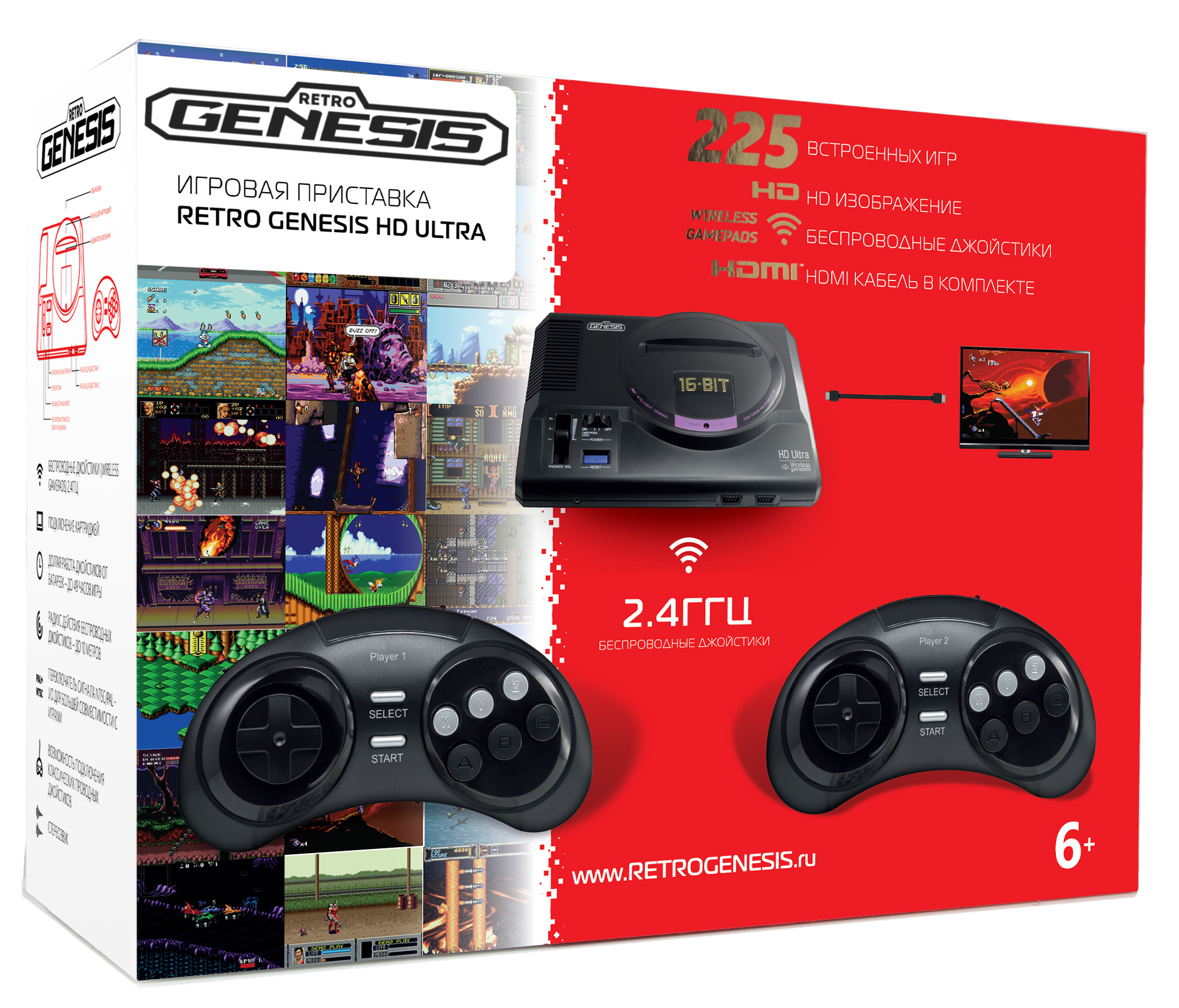Классическая приставка с 225 встроенными играми Retro Genesis HD Ultra оснащена технологией сглаживания изображения на больших экранах, максимально совместима с играми, а также обладает технологией отсутствия задержки игр.